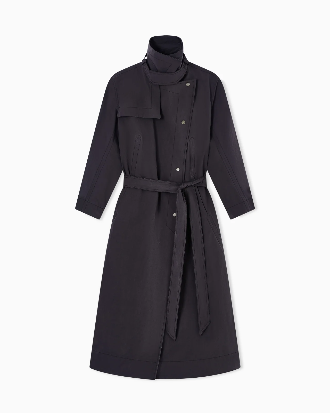 Technical fabric trench coat with a modern allure An essential style revisited with a modern twist, featuring a stand collar, asymmetrical fastening with press studs, two side pockets and a practical zipped breast pocket. The matching belt in the same fabric accentuates the waist and completes this elegant and refined piece with distinction. The piece is part of the New Normal selection, an offering that reinterprets the brand’s archive looks with a modern twist. Pieces in fluid shapes and with an androgynous flavour dress the feminine silhouette with elegance for day-to-night looks. This season it is presented in a natural colour palette with a sophisticated and authentic simplicity. Upright collar Asymmetric press-stud closure Matching-fabric belt Two side pockets Vertical zipped breast pocket Unlined Length: 125 cm from centre back Made in Italy Product Code: GW002577TE20143U8127