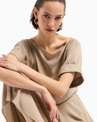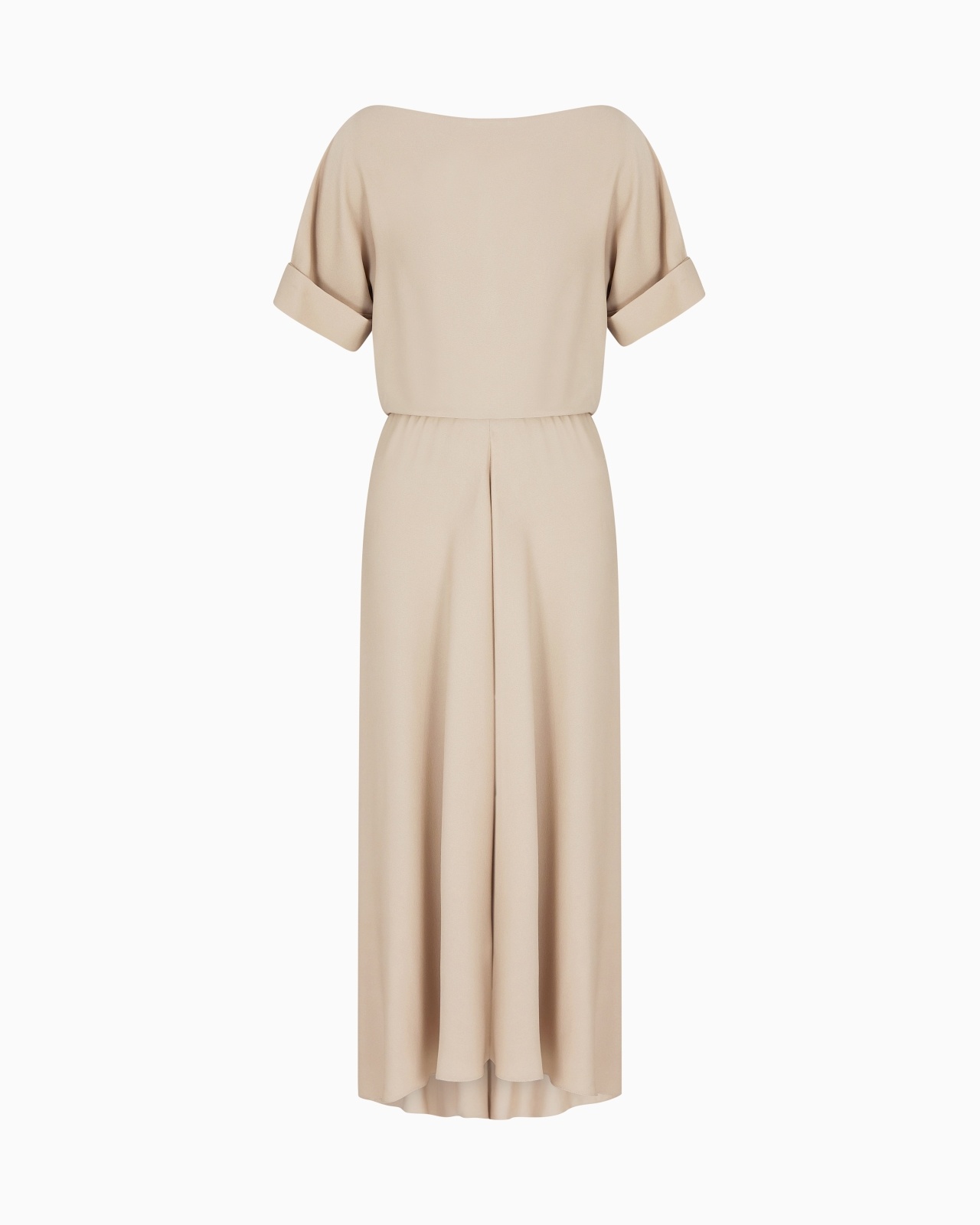 Clean, essential lines define this long dress in silk triple georgette. The style has an oval neckline, short sleeves with turn-ups and side slits and a skirt with pleats that add movement. Available in the collection refined colour palette, it is an elegant and sophisticated offering, perfect for various occasions, to be lit up with exquisite accessories. Oval neckline Short sleeves with turn-ups Bodice with blouson effect at the waist Back button at the neckline Skirt with draped pleats, longer at the back Lined Length: 98 cm from centre back Made in Italy Product Code: GW001318TE10814U8048