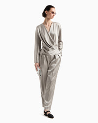 High-waisted trousers made from silk double satin, available in versatile shades. Featuring symmetrical pleats on the front and side pockets, they are an expression of the collection’s sophisticated spirit. Perfect paired with jackets and trousers for refined, elegant looks. Double pleats Waistband without loops Faced placket with zip closure Two slant pockets Back welt pocket Unlined Made in Italy Product Code: GW000641TE10101U8045