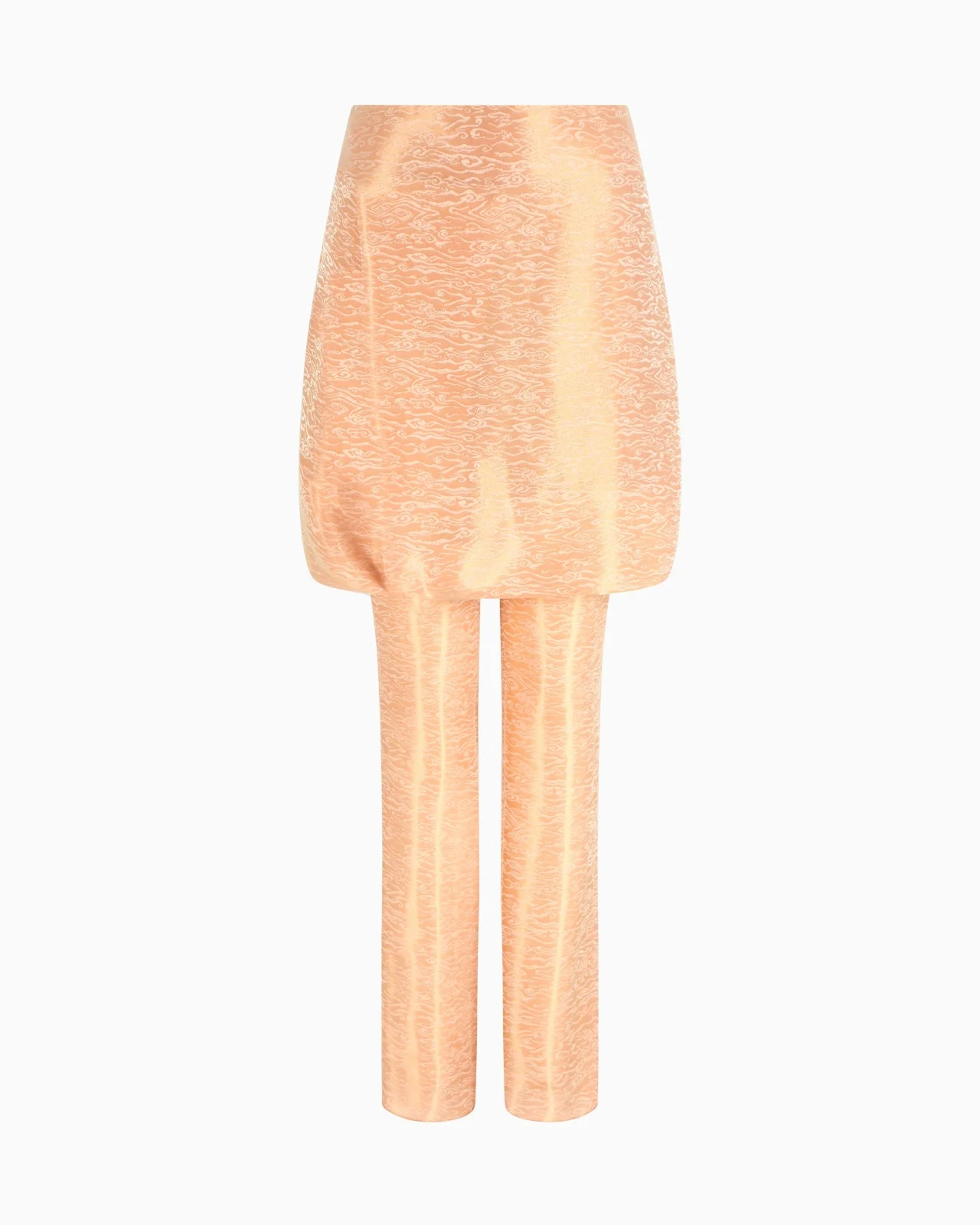 Distinctive straight trousers, made of jacquard viscose and silk with lurex, available in a warm clay colour. The style is distinguished by a short wrap skirt over the piece, creating a interplay of unusual and refined layering. An offering to team with the collection’s short jackets and exquisite tops, perfect for special looks. Smooth waistband Short wrap skirt detail with panel effect Two welt pockets Made in Italy Product Code: GW000647TE14276M6094
