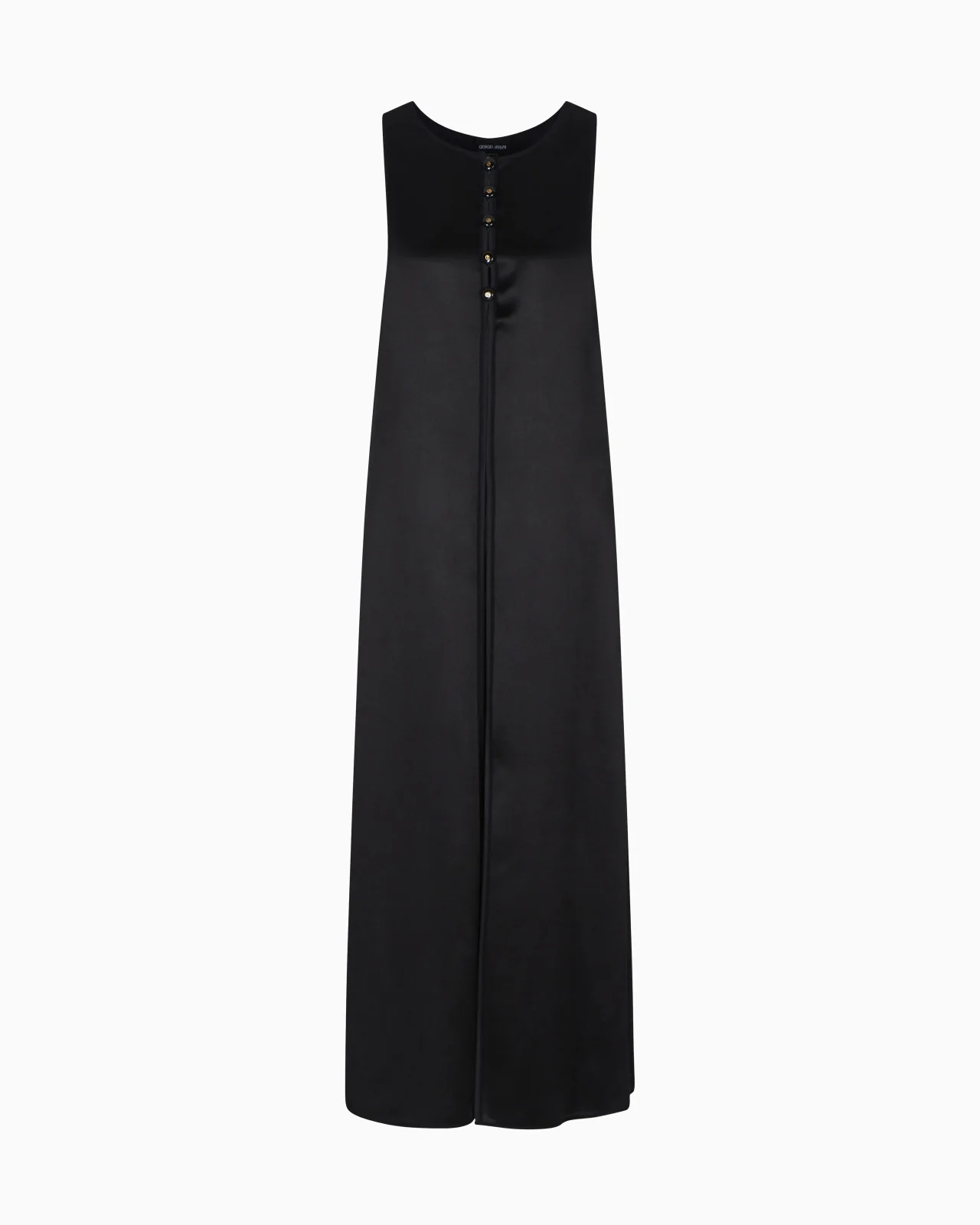 Distinctive long gilet made of tussah silk satin, a luxurious fabric of unparalleled refinement, extremely hard-wearing and fresh. The style, which can also be worn as a long tunic over a bandeau top for eastern-inspired looks, features a small logo button closure and deep slits that add movement while accentuating the lightness of the yarn.<br>The garment is part of the Holiday selection, which plays with a minimalist colour palette of black and white, colours that have always been a symbol of sophistication. A colour choice found in the fabrics, embroideries and accessories that express the essence of Armani spirit, distinguished by clean, androgynous-inspired lines, that are still always feminine and sensual. Crew neck Front closure with small logo buttons Deep side slits Front slit Colour-matched piping Unlined Length: 125 cm from centre back Made in Italy Product Code: GW001583TE15808UC001