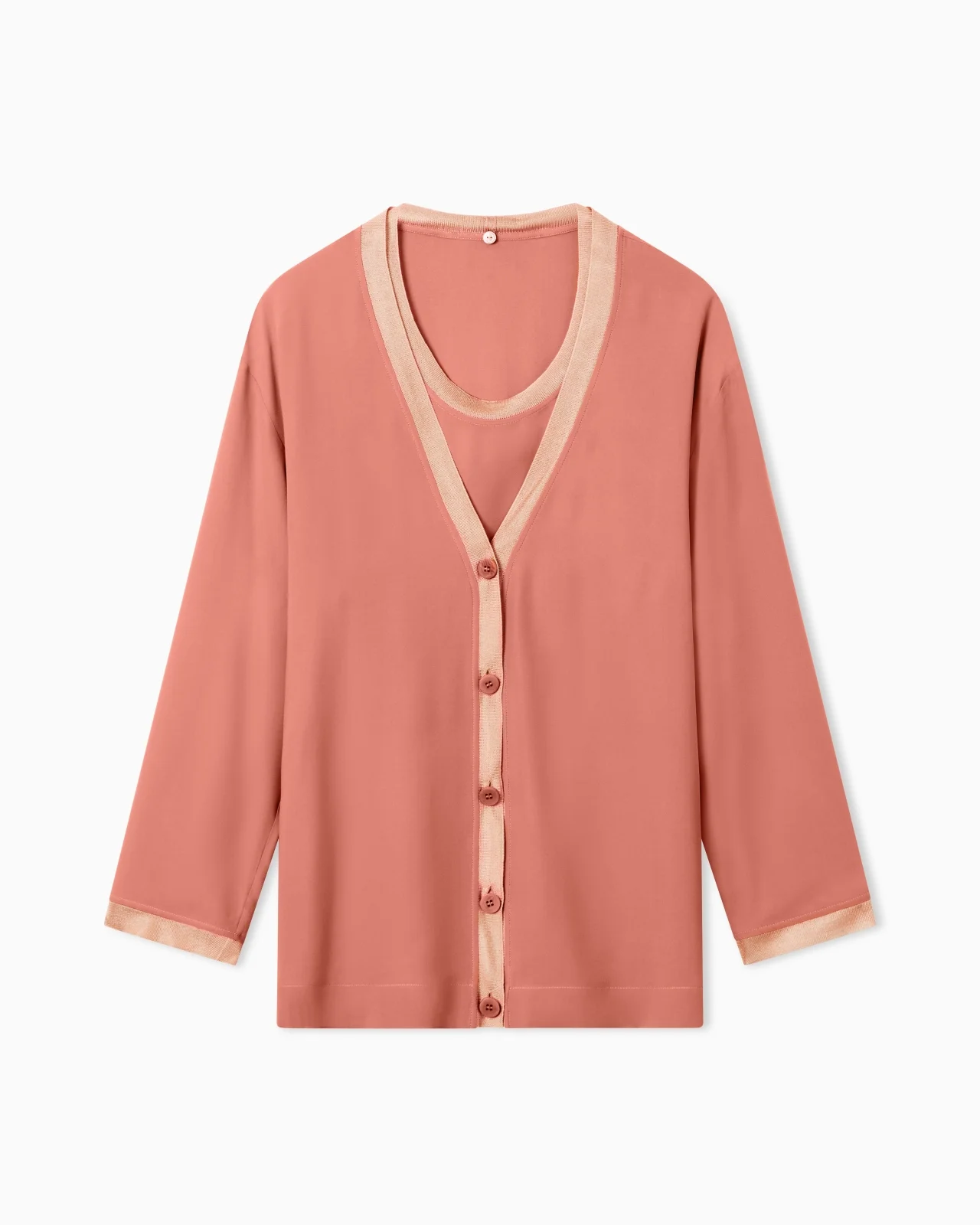 Relaxed, flowing lines for this long cardigan, made of silk georgette, with a V neck, front buttoning and ribbed trim. The style, combined with a short-sleeved crew-neck jumper, creates a versatile twin-set with a casual allure, perfect for the daytime. The piece is part of the New Normal selection, an offering that reinterprets the brand’s archive looks with a modern twist. Pieces in fluid shapes and with an androgynous flavour dress the feminine silhouette with elegance for day-to-night looks. This season it is presented in a natural colour palette with a sophisticated and authentic simplicity. Twin-set consisting of: Cardigan with a V-neck, visible front buttoning and ribbed trims Crew-neck, short-sleeved jumper with ribbed trim Made in Italy Product Code: GW003008TE14025U3010