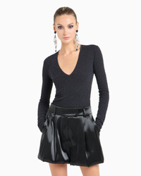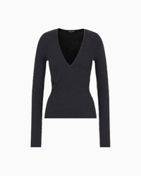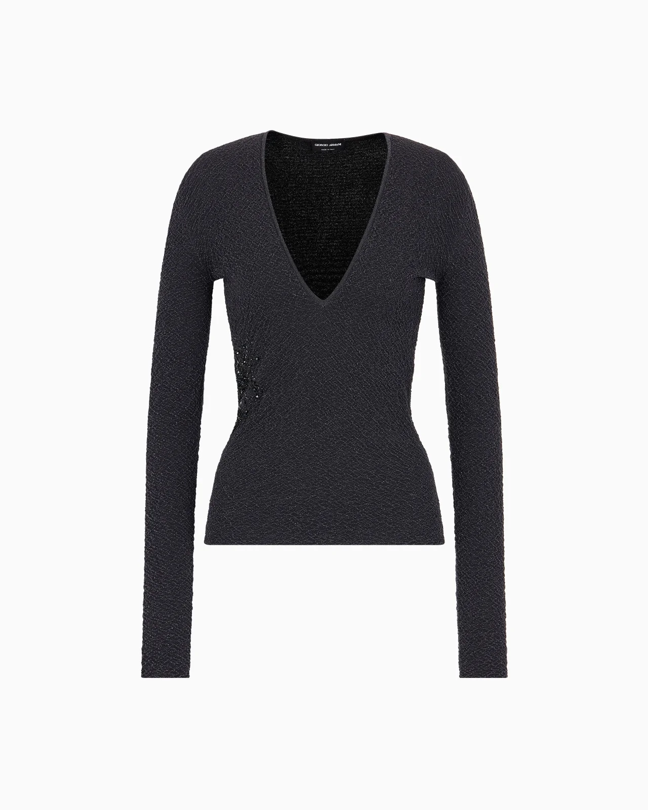 V-neck jumper made from embossed viscose, illuminated by metallic thread. Its versatile,clean lines, which allow it to be paired with the collection's trousers and skirts, are embellished with matching floral-inspired side embroidery. The piece is part of the exclusive collection that celebrates the connection between Giorgio Armani and the world of Hollywood. A colour palette of deep blues combines with a profound and ever-elegant black, to create a sparkling, luxurious selection inspired by the limelight and most exclusive Hollywood parties. Extremely sophisticated pieces with iconic lines are made of velvets, silks and satins enlivened by crystal and rhinestone embellishments and refined workmanship. Looks for him and her, designed for evenings and special occasions. Fineness: 18 V neck Long sleeves Monochromatic floral embroidery with beads, baguettes and sequins Made in Italy Product Code: GW001469AF17406FC027