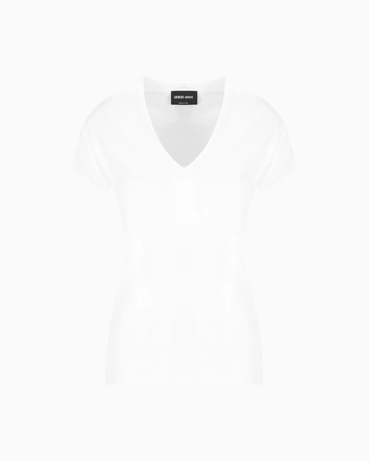 A garment which gets itself noticed due to its simple, linear style. Knitted top with kimono sleeves and deep V-neck. Product Code: 8NAM94AJV7Z10101 Details Composition 90% Viscose 10% Cashmere Jersey V-neck Short sleeves