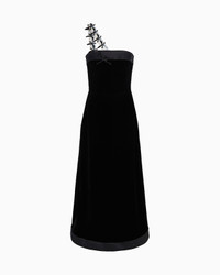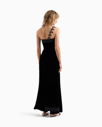 Exquisite, sophisticated and elegant bustier dress made of dense and very soft viscose and silk velvet. The style, featuring internal stays and an invisible zip fastening on the back, is embellished with silk-satin bands on the neckline and hem and an exquisite one-shoulder strap, lit up by ethereal dragonflies embroidered with black sequins, beads and baguettes. A striking dress that is perfect for special occasions. Featuring internal stays, zip closure, lining, two side welt pockets, and a silk-satin trim. Matching-tone dragonfly embroidery detail with black beads, sequins and baguettes, see-through tulle shoulder strap with dragonflies embroidered in velvet with multicoloured bead and rhinestones. Length: 105 Product Code: GW000575AF12973ZZ017