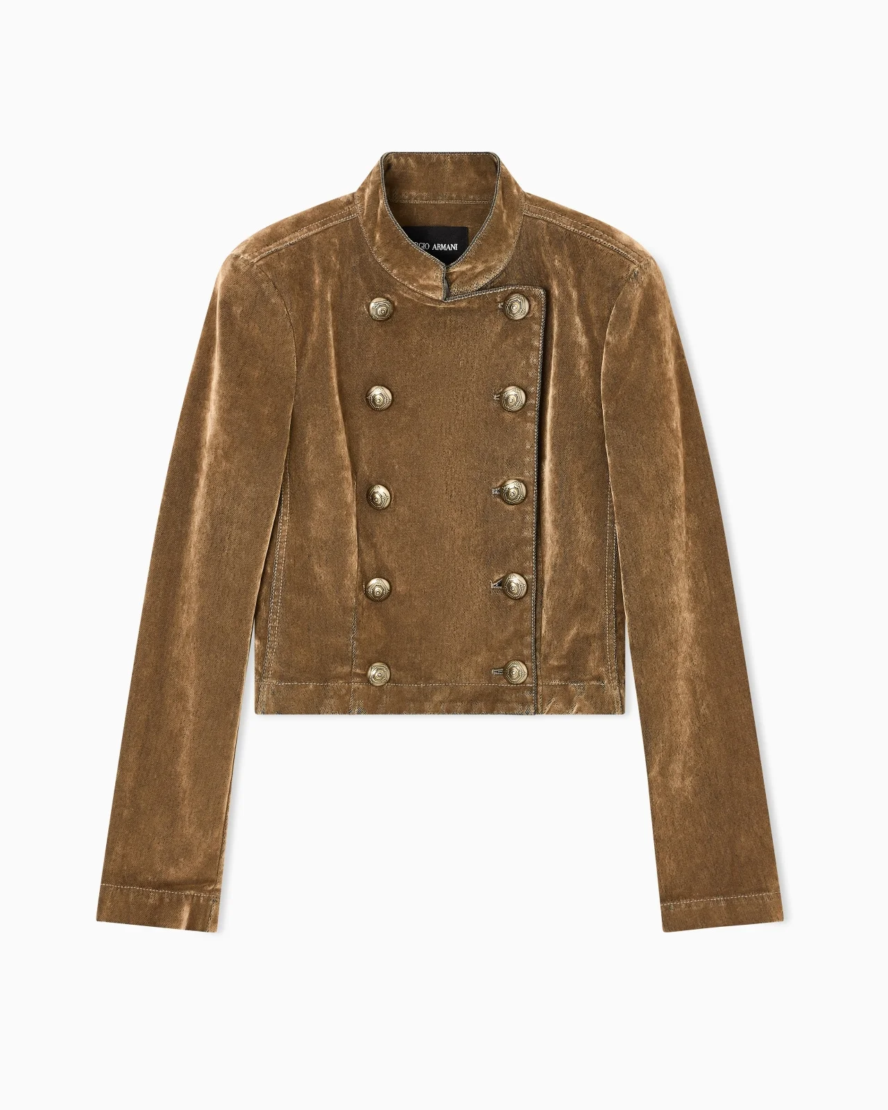Military-inspired short jacket crafted from velvet with a distinctive vintage appearance. The item, with a guru collar and double-breasted fastening with special buttons, features an androgynous style, reinterpreted with a feminine twist. An offering designed to wear with daytime looks, perfect for pairing with the matching trousers and a jumper with clean lines. The piece is part of the New Normal selection, an offering that reinterprets the brand’s archive looks with a modern twist. Pieces in elongated and fluid shapes and with an androgynous flavour dress the feminine silhouette with elegance for day-to-night looks. This season it comes in a natural colour palette animated by a series of chevron motif and houndstooth shapes, a clear reinterpretation of pieces "stolen" from the male wardrobe with a feminine twist. Guru collar Double-breasted closure with special logo buttons Cuff button Unlined Length: 46 cm from centre back Made in Italy Product Code: GW002340TE17140M6147