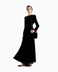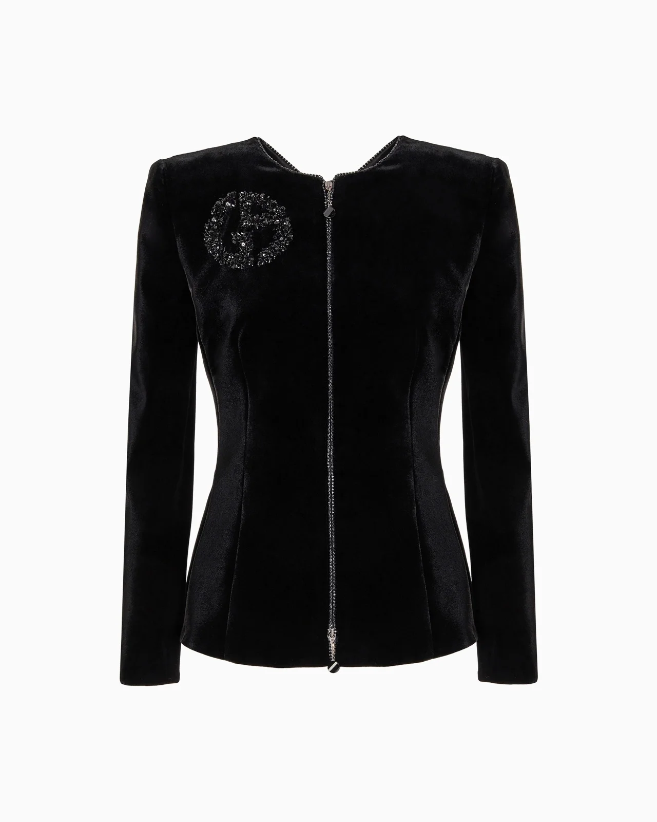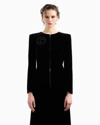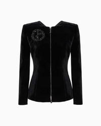 Distinctive jacket made of the collection velvet, with form-fitting lines that elegantly accentuate the feminine silhouette. The style, illuminated by black rhinestone piping and a GA logo embroidered with black crystals, beads and jet beads, features a cut-out detail on the back, framed by two velvet bows, adding a sensual touch to the piece. Wear it with a top and straight trousers for a sophisticated, refined evening look. Slim fit Crew neck Zip fastening with double pull tab and crystal piping GA logo embroidered in crystals, beads and black jet with 3D-effect floral motifs Cut-out detail on the back with bows Silk lining Length: 63 cm Made in Italy Product Code: GW000609AF13501ZZ017