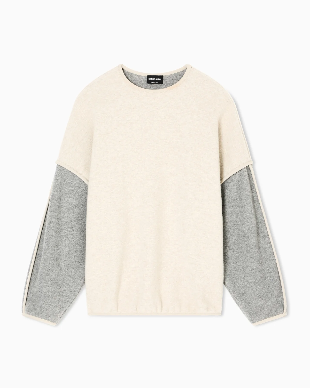 Crew-neck sweatshirt made of virgin wool and cashmere with relaxed, comfortable volumes. The style, characterised by the layering effect created by the two-tone sleeves, is customised with a monochromatic GA logo on the neckline and lends itself to completing a casual daytime look. The piece is part of the New Normal selection, an offering that reinterprets the brand’s archive looks with a modern twist. Pieces in elongated and fluid shapes and with an androgynous flavour dress the feminine silhouette with elegance for day-to-night looks. This season it comes in a natural colour palette animated by a series of chevron motif and houndstooth shapes, a clear reinterpretation of pieces "stolen" from the male wardrobe with a feminine twist. Crew neck Wide long sleeves with a layering effect Contrasting piping on the sleeves Monochromatic GA logo on the back of the neck Made in Italy Product Code: GW002061AF19676F1055