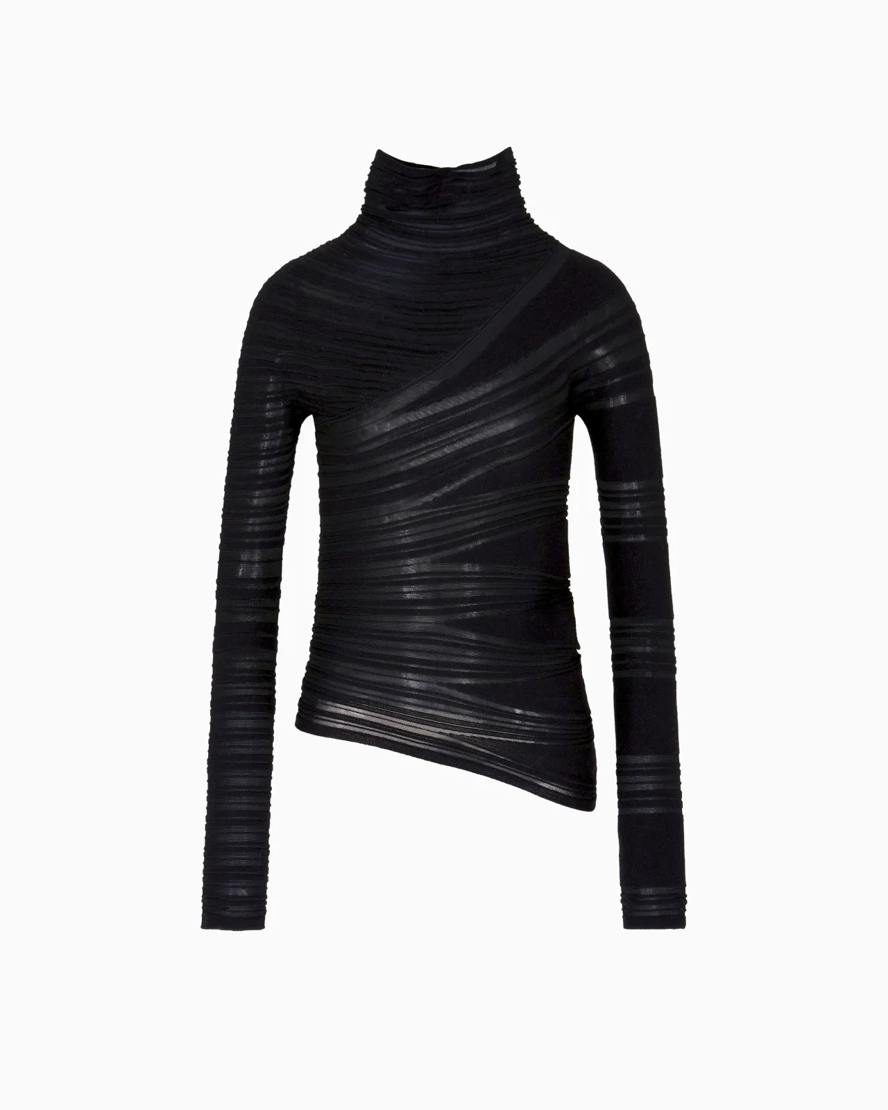 Long-sleeved jumper made of viscose and virgin wool, embellished with a KFB construction with horizontal ribbing, creating a three-dimensional effect. The asymmetric hem adds additional movement, picking up the diagonal motif. A sophisticated piece, perfect for distinguishing numerous outfits. Mock neck Long sleeves KFB construction with alternating horizontal ribbing Asymmetric hem Made in Italy Product Code: GW002137AF19807UC001
