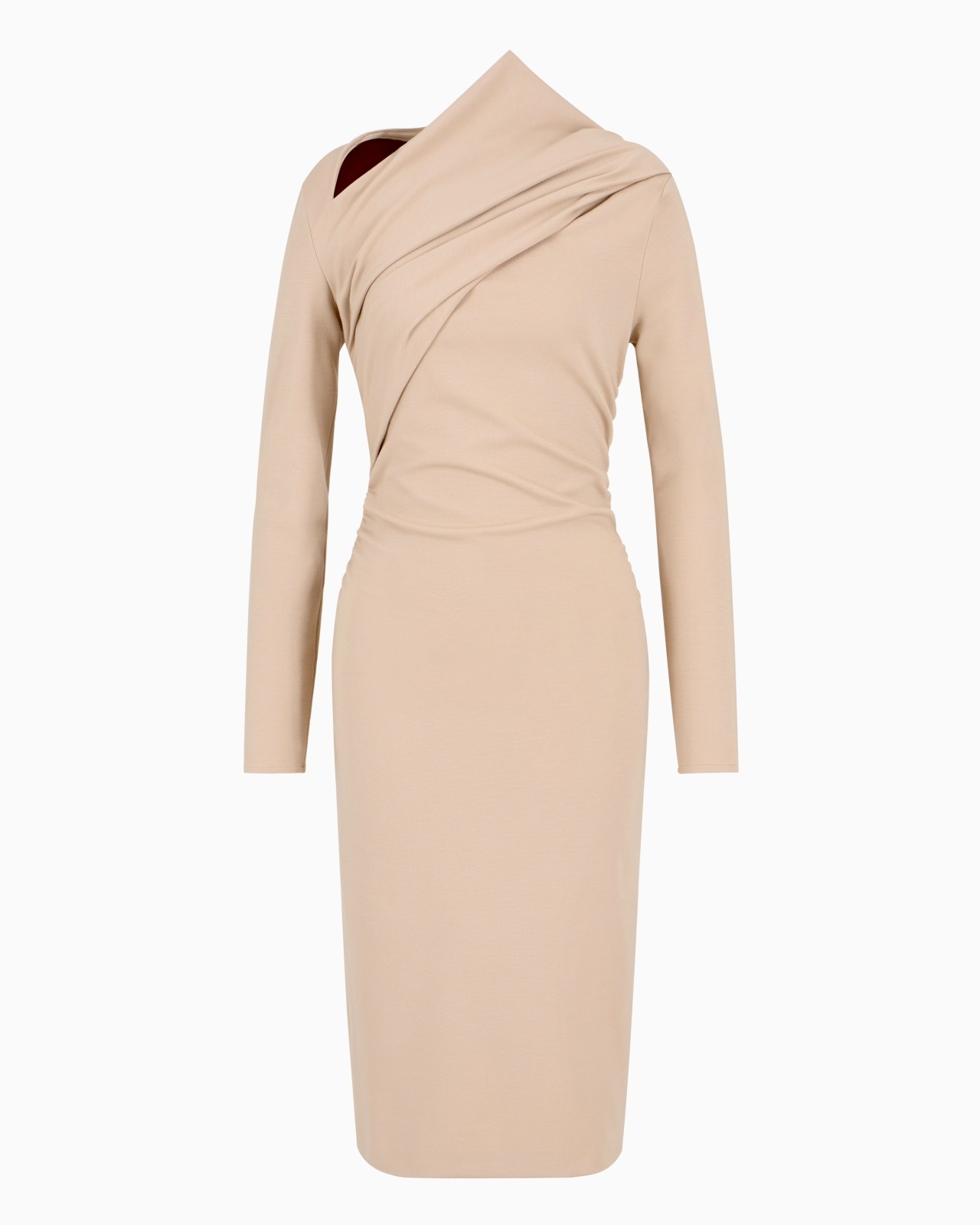 Sleek, refined midi dress, featuring a slim fit that accents and enhances the silhouette. Crafted in Milano-stitch viscose, it is embellished with a draped asymmetric neckline. This sophisticated style can be worn for day or evening looks, simply by changing accessories. Draped asymmetric neckline Long sleeves Made in Italy Product Code: GW001620AF15509U6071