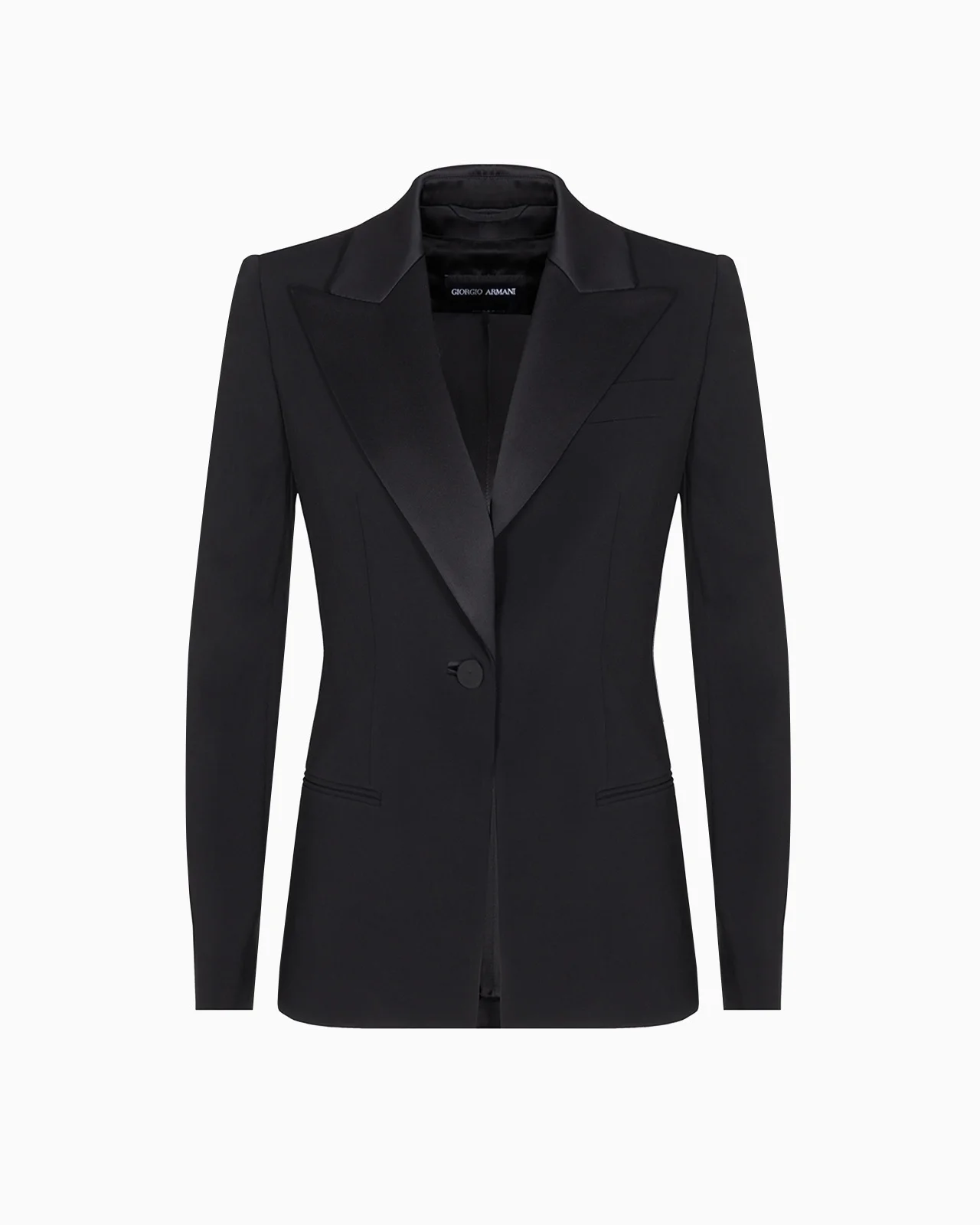 Made from viscose cady, this tuxedo jacket adds an elegant, evergreen allure to evening looks. It features a single-breasted closure, two welt pockets and wide, monochromatic, satin peak lapels. Single-breasted jacket Satin peak lapels Welt pockets Breast pocket Closure with single, silk-satin covered button Silk-satin lining Silk-satin buttoned cuffs Length: 65 cm Made in Italy Product Code: 2SHGG0SOT03C9PZ01