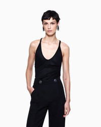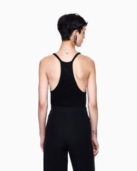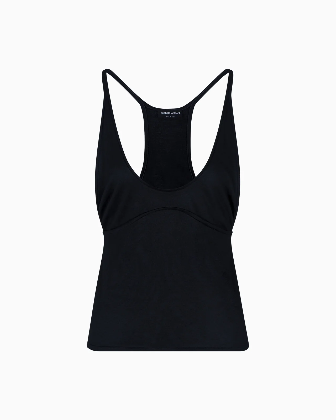 Top made of viscose jersey, featuring a deep front neckline and essential design. The black and white style is customised on the back with a metal GA logo and can be worn as a daytime look with the collection's jumpers and jackets.<br>The garment is part of the Holiday selection, which plays with a minimalist colour palette of black and white, colours that have always been a symbol of sophistication. A colour choice found in the fabrics, embroideries and accessories that express the essence of Armani spirit, distinguished by clean, androgynous-inspired lines, that are still always feminine and sensual. Wide collar Thin shoulder straps Length: 54 cm Made in Italy Product Code: GW001826AF18818UC001