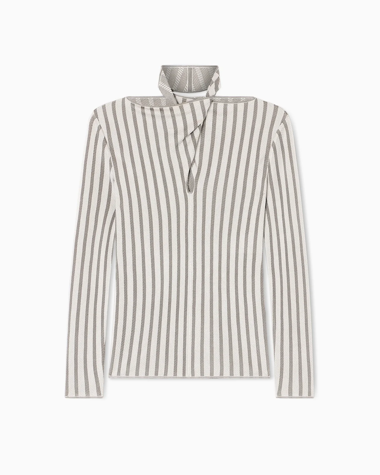 Relaxed long-sleeved jumper made from viscose distinguished by two-tone jacquard stripes. The style is embellished with a draped collar detail and shoulder pads that add structure to the piece. Fineness: 18 Draped stand collar Long sleeves Shoulder pads Colour-matched piping Made in Italy Product Code: GW000904AF14928F7003