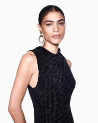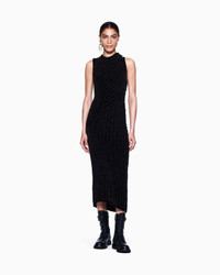 Midi dress made from a comfortable viscose knit, featuring a ribbed knit that follows and accentuates the silhouette, creating an almost sculptural movement. The sleeveless style, with a slightly stand collar, has a slim but comfortable fit and is perfect for creating daytime looks with a modern, feminine style. Fineness: 5 3x3 ribbing Slight upright collar Sleeveless Length: 85 cm from the waist Made in Italy Product Code: GW002367AF19806O6009