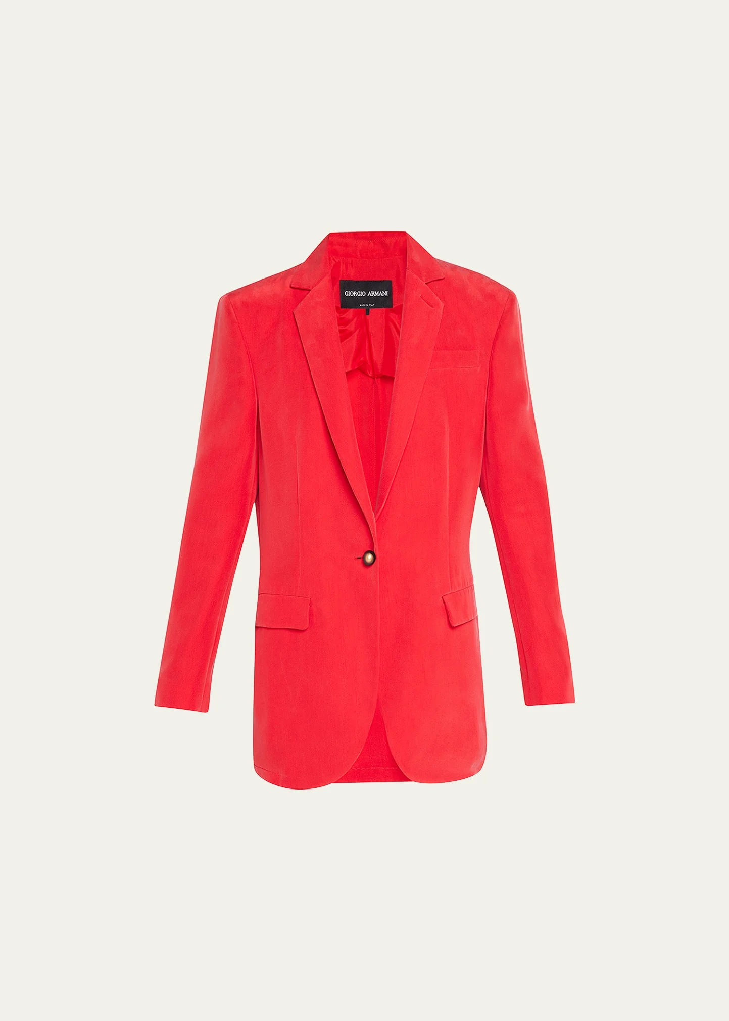 Giorgio Armani washed silk blazer jacket with a single button front Notched collar Long sleeves Side flap pockets; front welt pocket Back center slit Hip length Tailored fit Silk Dry clean Made in Italy