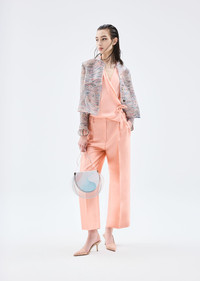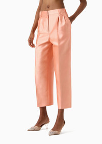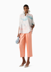 Wide, draped, ankle-length silk shantung trousers. The style, with an elasticated waistband and two side pockets, features a front dart and minimalist line. In marine-inspired hues, they lend themselves to numerous looks, teamed with the collection’s jackets and shirts. Product Code: 4SHPP133T04UG1U47W Details Composition 100% Mulberry silk Elasticated waistband with loops at the sides and back Concealed zip-and-hook closure Two side pockets on the hips Back welt pocket Cuff width: 26 cm Made in Italy Fitting The model is 178 cm tall and is wearing size 38/S