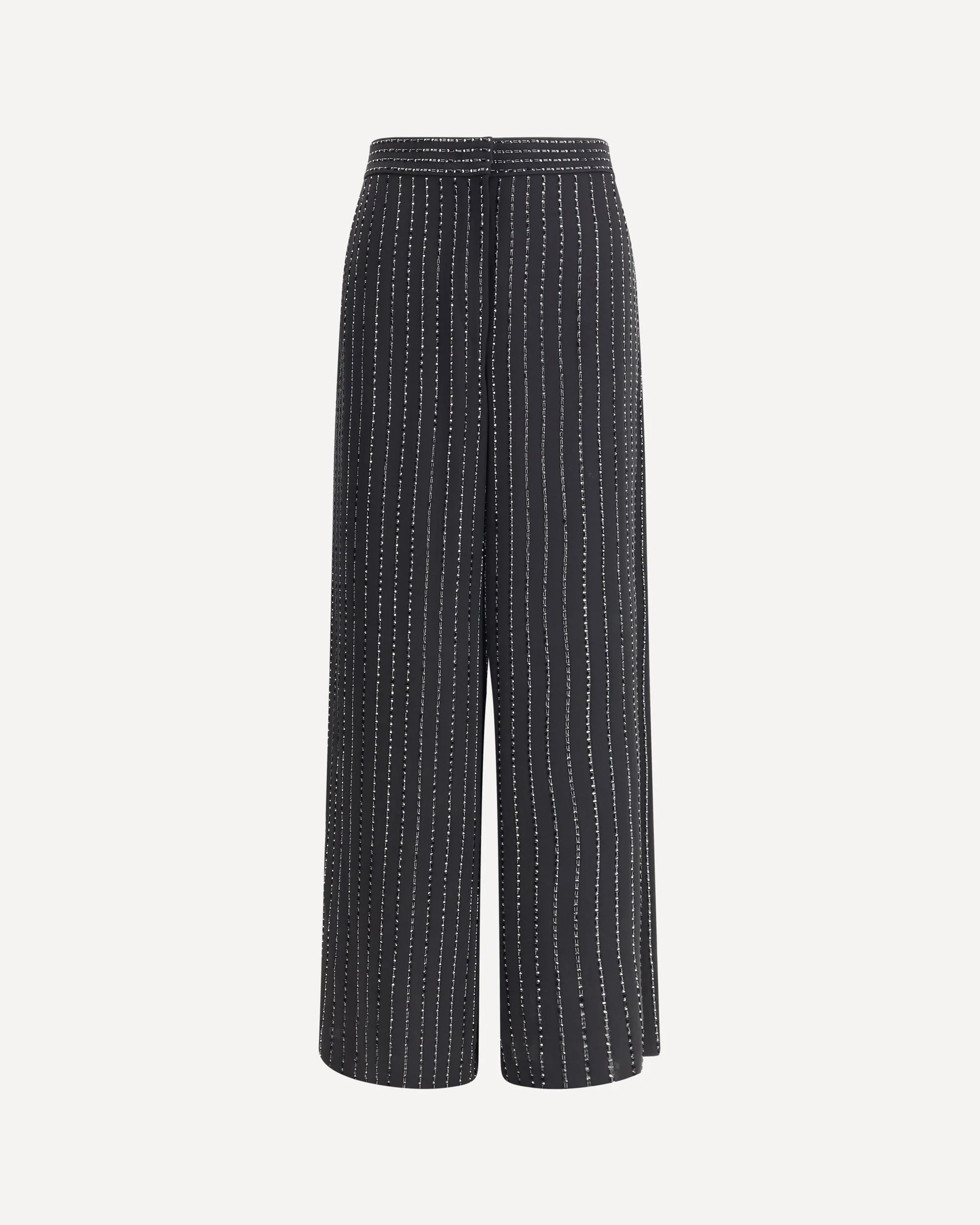 Giorgio Armani's wide-leg silk Pants stand out for their elegant flowing lines and refined details. Featuring a smooth waistband, concealed fastening, and side pockets, they are embellished with rich, tone-on-tone embroidery made with baguettes and sequins, creating a luminous pinstripe pattern, lending the garment a touch of glamour and sophistication. DETAILS - Sku: GW001542_ZZ017 - Season: AW25 - Fit: Regular - Composition: GENERAL 100% Silk - MADE IN ITALY