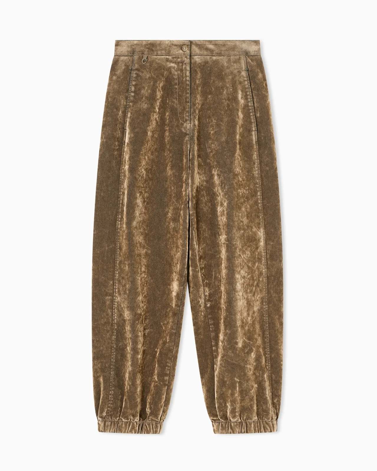 Military-inspired wide-leg trousers crafted from velvet with a distinctive vintage appearance. The style, with a smooth waistband and zip fastening, features an androgynous style, reinterpreted with a feminine twist. An offering designed to wear with daytime looks, perfect for pairing with the matching short jacket and a jumper with clean lines. The piece is part of the New Normal selection, an offering that reinterprets the brand’s archive looks with a modern twist. Pieces in elongated and fluid shapes and with an androgynous flavour dress the feminine silhouette with elegance for day-to-night looks. This season it comes in a natural colour palette animated by a series of chevron motif and houndstooth shapes, a clear reinterpretation of pieces "stolen" from the male wardrobe with a feminine twist. Smooth waistband Button and zip closure Two front vertical pockets Two flap and button pockets on the back Elasticated ankle cuff Unlined Length: 100 cm Made in Italy Product Code: GW001774TE17140M6147