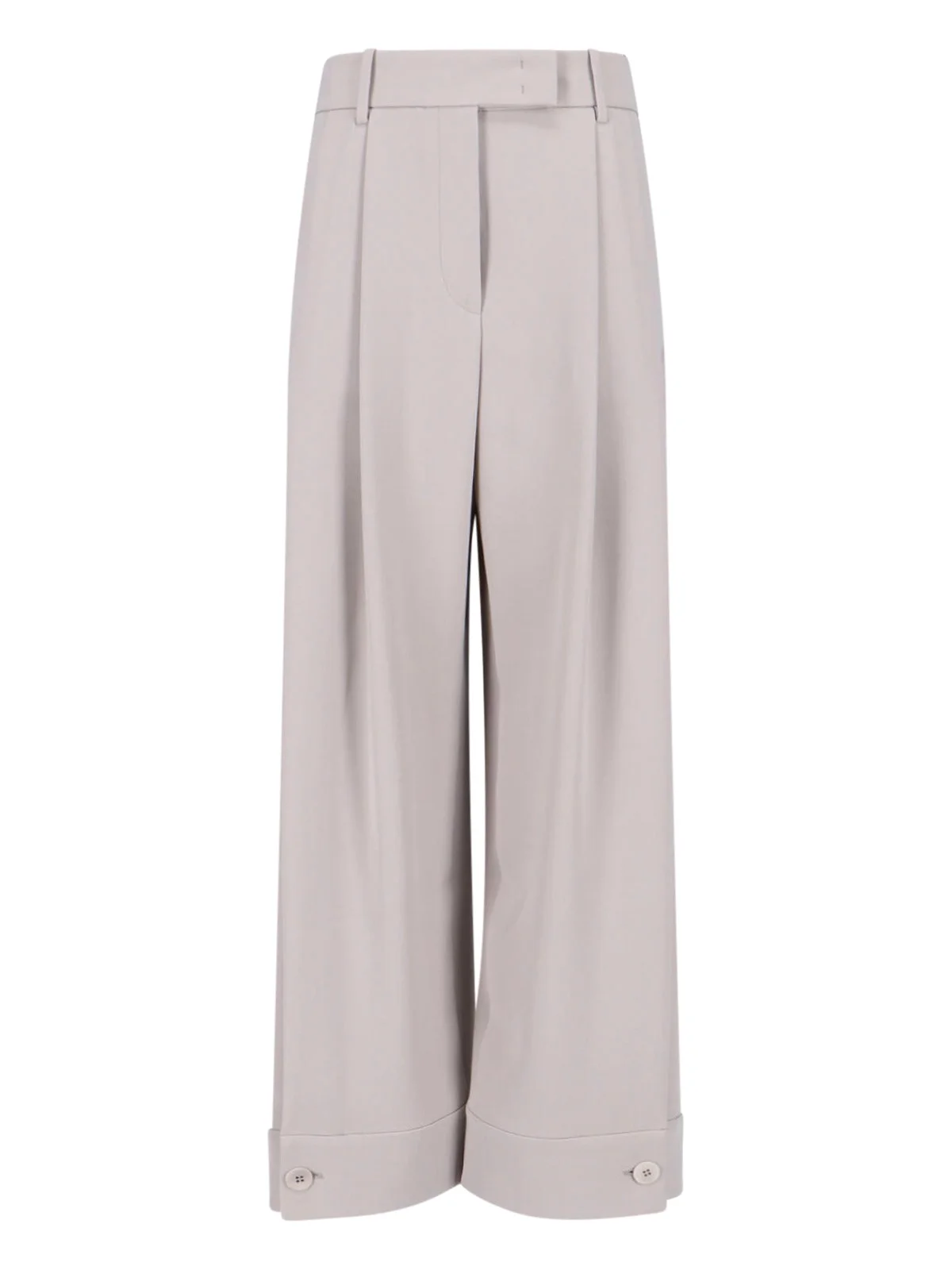 GIORGIO ARMANI WIDE GREY SILK TROUSERS WITH HIGH WAIST, HOOK CLOSURE, BELT LOOPS, TWO SIDE SLANTED POCKETS, FRONT PLEATS, WIDE LEG. PRODUCT INFO PRODUCT CODE GW002497 TE10071U8038 COMPOSITION: 100% SILK SIZE AND FIT: SOFT FIT MADE IN: ITALY