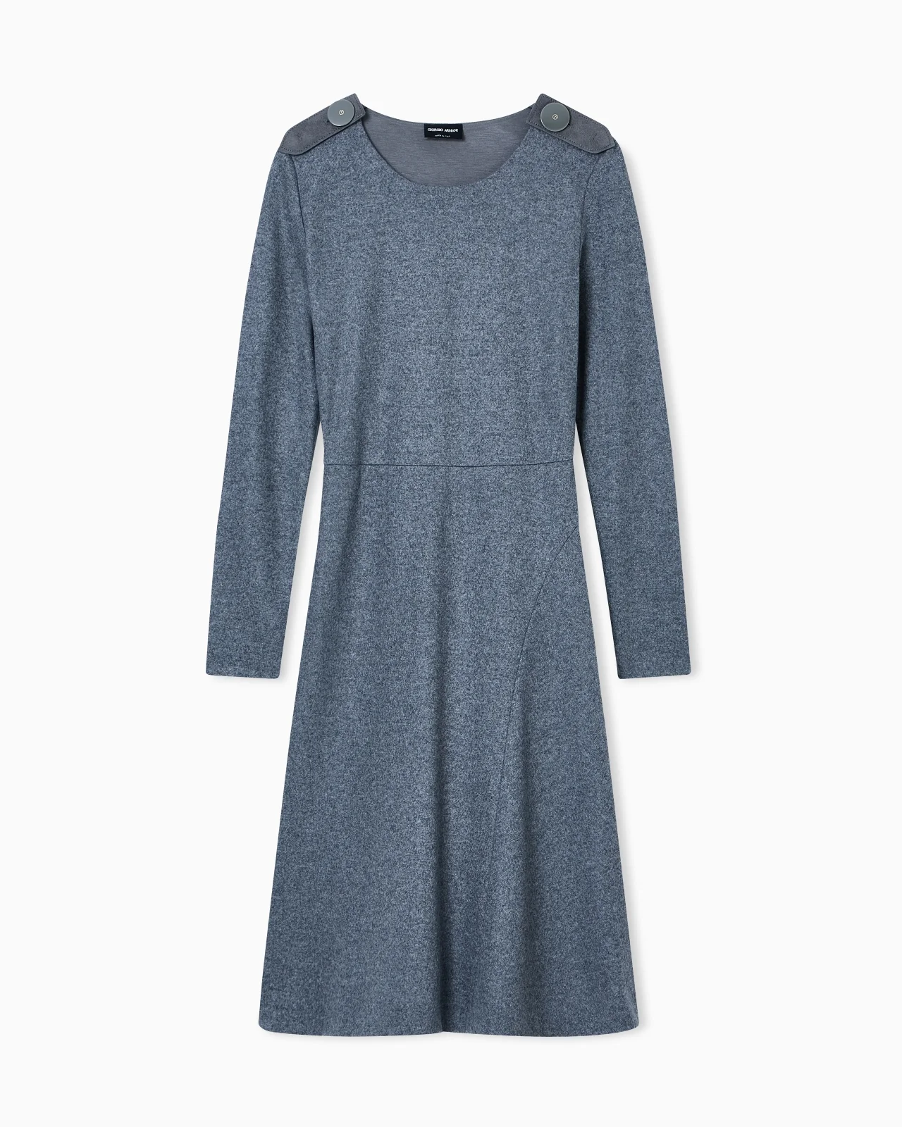 Elegant and refined dress with a flared skirt, highlighting and accentuating the silhouette. Made from wool jersey, it is embellished with epaulettes with a logo button. This sophisticated style can be worn for day or evening looks, simply by changing accessories. The piece is part of the New Normal selection, an offering that reinterprets the brand’s archive looks with a modern twist. Pieces in elongated and fluid shapes and with an androgynous flavour dress the feminine silhouette with elegance for day-to-night looks. This season it comes in a natural colour palette animated by a series of chevron motif and houndstooth shapes, a clear reinterpretation of pieces "stolen" from the male wardrobe with a feminine twist. Oval neckline Long sleeves Epaulettes detail with logo button Skirt flared at the knee Length from the waist: 64 cm Length from centre back: 108 cm Made in Italy Product Code: GW002158AF17762O8024