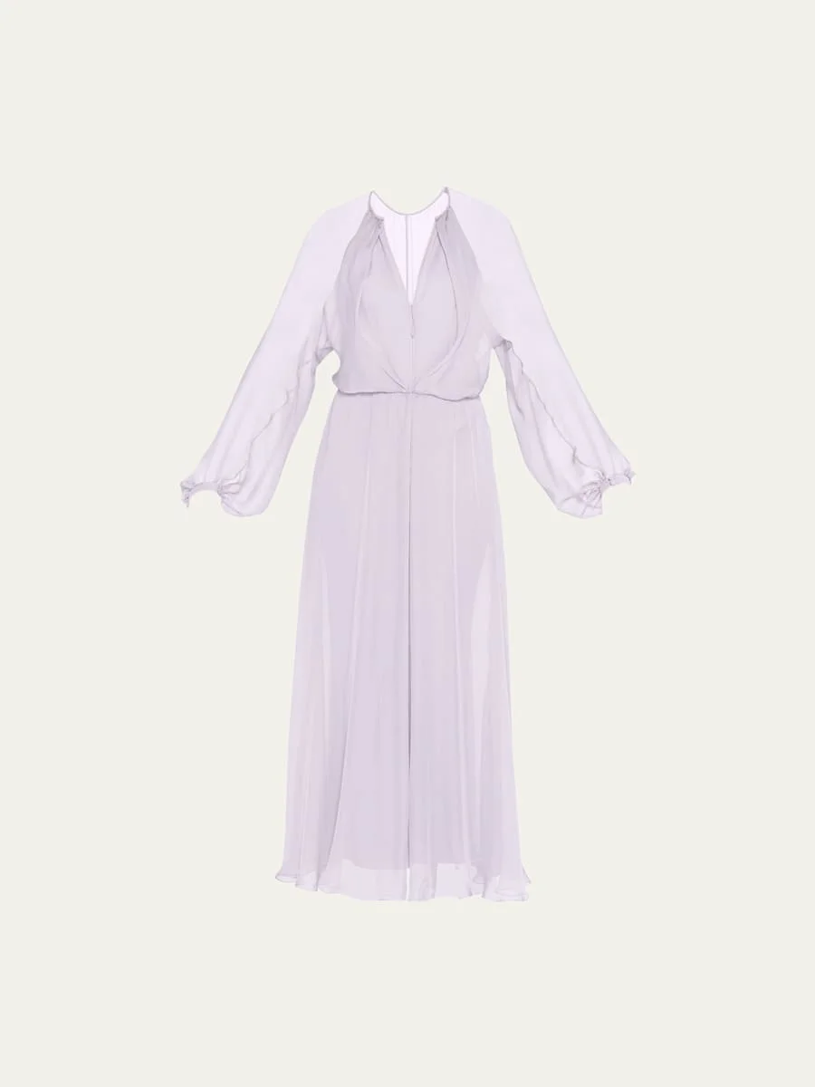 Zip-Front Long-Sleeve Silk Chiffon Layered Gown