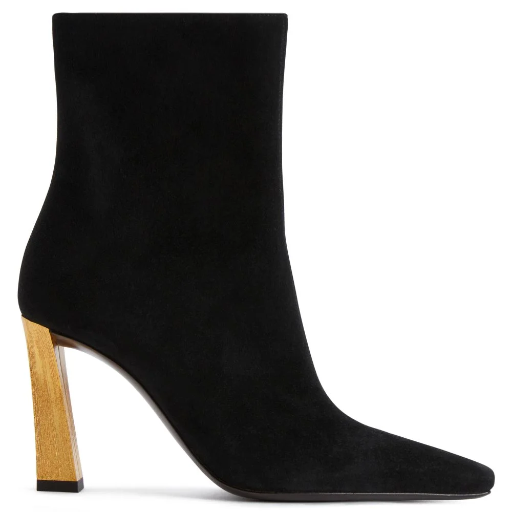 Product Details Ankle boots in suede leather with elongated square toe, inner zipper to help put them on and knurled metal-effect block heel. - Black suede leather with inner side zipper - 90 mm-high heel with gold-colored knurled metal effect. - Brown leather sole with logo ORIGIN: ITALY COLOR: BLACK