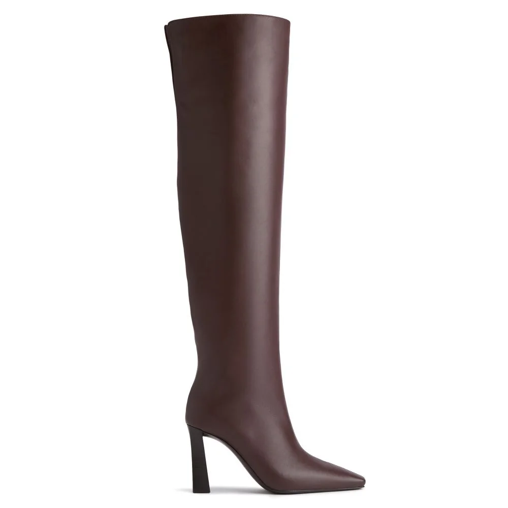 Product Details Over-the-knee boots in leather with back slit and elongated square toe. Block heel with metal stitch detail. - Brown leather - Light gold-colored metal detail on the heel - 90 mm-high heel covered in dark brown leather. - Brown leather sole and black non-slip rubber with logo ORIGIN: ITALY COLOR: BROWN