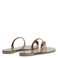 Product Details Flat leather thong sandals with natural stone-effect ring accessory and matching lacquer-finish sole. - Taupe-coloured leather - Silver-coloured metal accessory with amber-coloured glass - Heel height: 10 mm - Shiny taupe leather sole with logo ORIGIN: ITALY COLOR: BEIGE