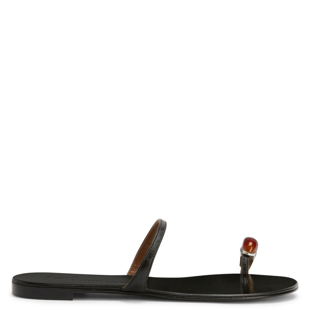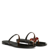 Product Details Flat leather thong sandals with natural stone-effect ring accessory and matching lacquer-finish sole. - Black leather - Silver-coloured metal accessory with amber-coloured glass - Heel height: 10 mm - Shiny black leather sole with logo ORIGIN: ITALY COLOR: BLACK