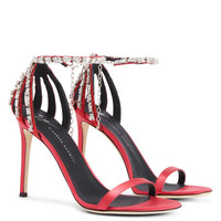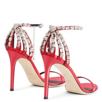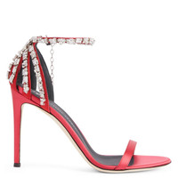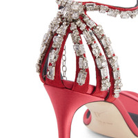 Product Details Sandals crafted from cherry red satin and suede and embellished with a bright silver metal jewel accessory on the heel with crystal rhinestones, with matching ankle strap; matching covered stiletto heels and a leather sole give the design the perfect finish. Cherry-coloured satin and suede upper Silver metal and crystal rhinestones heel accessory and ankle strap 105 mm heel Heel covered in cherry-coloured satin Leather sole with logo Made in Italy