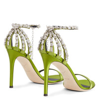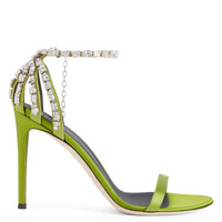 Product Details Sandals crafted from acid green satin and suede and embellished with a bright silver metal jewel accessory on the heel with crystal rhinestones, with matching ankle strap; matching covered stiletto heels and a leather sole give the design the perfect finish. Acid green satin and suede upper Silver metal and crystal rhinestones heel accessory and ankle strap 105 mm heel Heel covered in acid-green satin Leather sole with logo Made in Italy