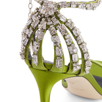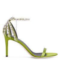 Product Details Sandals crafted from acid green satin and suede and embellished with a bright silver metal jewel accessory on the heel with crystal rhinestones, with matching ankle strap; matching covered stiletto heels and a leather sole give the design the perfect finish. Acid green satin and suede upper Silver metal and crystal rhinestones heel accessory and ankle strap 85 mm heel Heel covered in acid-green satin Leather sole with logo Made in Italy