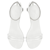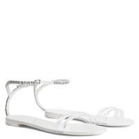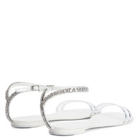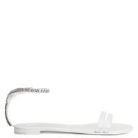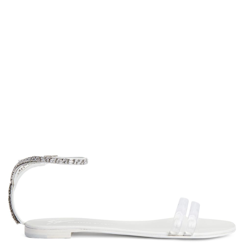 Product Details Flat sandals crafted from white patent leather with matching leather sole, featuring a clear PVC double front band and a silver metal jewel accessory with crystals that embellishes the whole ankle strap. Clear PVC (100% PVC) and white synthetic patent leather strap (34% PL; 66% PU) Jewel accessory with silver-coloured metal and crystal rhinestones White leather sole with logo Made in Italy