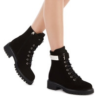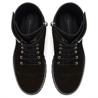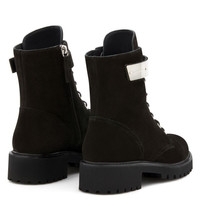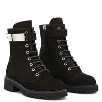 Product Details These black suede biker boots are characterized by the metal Signature plate on the side. The design is completed by metal hoops matching the colour of the metal plate, and by a rubber sole with logo. Black suede Metal plaque with signature Rubber sole with logo Made in Italy