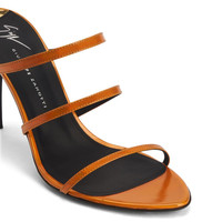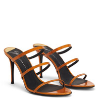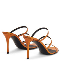 Product Details Mules crafted from orange iridescent synthetic fabric with a mirror effect, featuring matching covered stiletto heels, black leather soles embellished with golden details and three thin straps. Orange synthetic fabric with iridescent mirror effect (70% PU; 30% PL) 90 mm heel Orange synthetic fabric with iridescent mirror effect covered heel (70% PU; 30% PL) Black leather sole with logo Made in Italy
