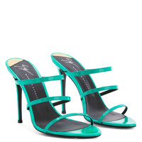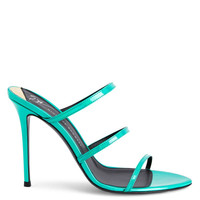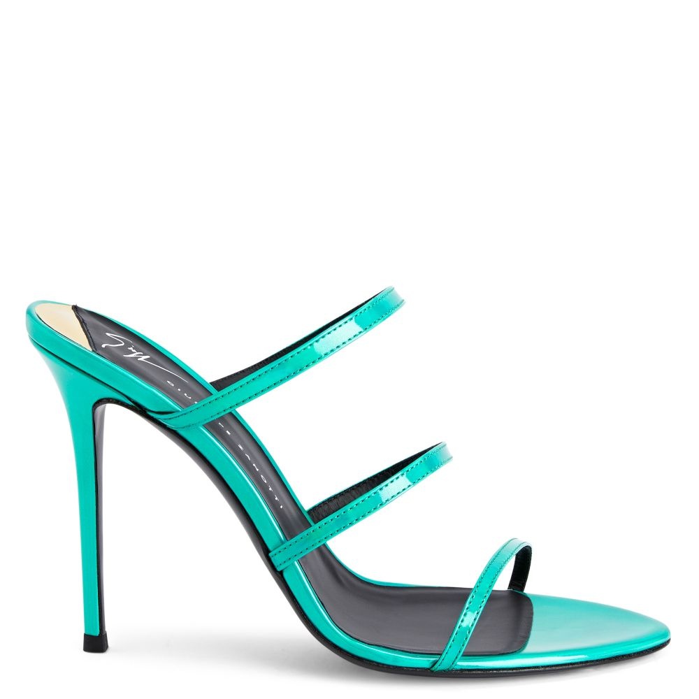 Product Details Mules crafted from emerald green iridescent synthetic fabric with a mirror effect, featuring matching covered stiletto heels, black leather soles embellished with golden details and three thin straps. Emerald green iridescent mirror-effect synthetic fabric (70% PU; 30% PL) 105 mm heel Emerald green iridescent mirror-effect synthetic fabric covered heel (70% PU; 30% PL) Black leather sole with logo Made in Italy