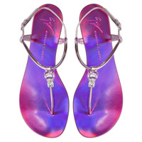 Product Details Flat thong sandals in pink, mirror-effect synthetic fabric with matching laminated leather sole, thin straps and small metal side buckle, embellished with a silver metal accessory with pink and crystal rhinestones. Pink mirror-effect synthetic fabric (75% PU; 20% PL; 5% VI) Silver metal accessory with pink and crystal rhinestones Adjustable ankle strap with silver metal buckle 10 mm heel Fuchsia, iridescent and laminated leather sole with logo Made in Italy