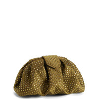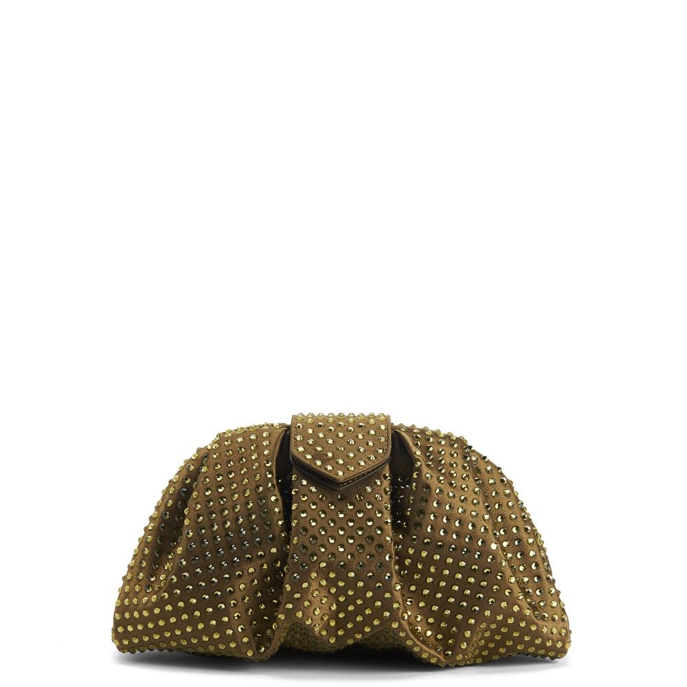 Product Details Pouch bag crafted from satin-effect khaki synthetic fabric, embellished with an all-over crystal rhinestones embroidery and featuring a magnetic fastening and fabric inner lining with card slots. Khaki synthetic satin fabric Crystal rhinestones embroidery Magnetic fastening Black fabric inner lining with card slots Measurements: 230 mm x 170 mm x 130 mm Made in Italy