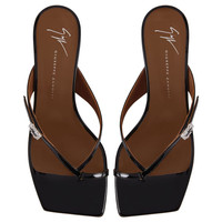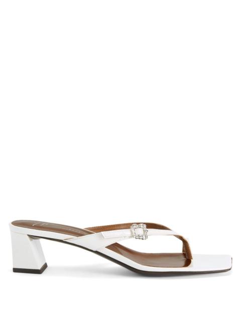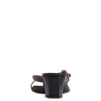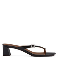 Product Details Thong sandals in patent leather with jewel buckle and chunky heel. - Black patent leather - Silver-coloured metal buckle with crystal-coloured rhinestones - 45 mm-high heel. - Brown leather sole with logo ORIGIN: ITALY COLOR: BLACK