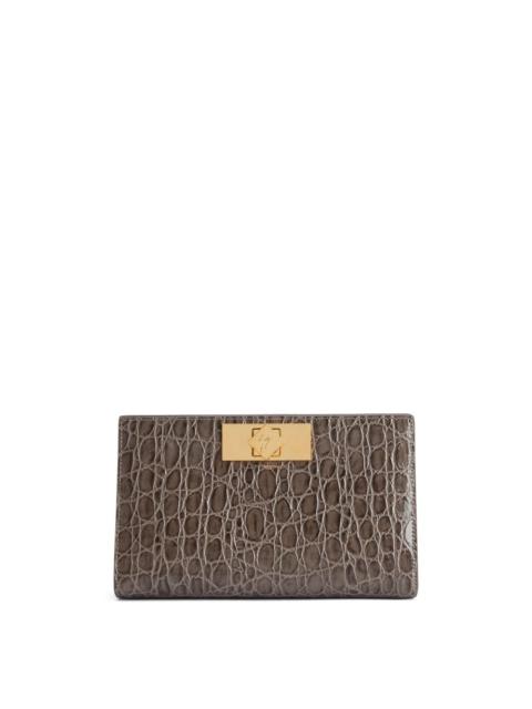 Product Details Clutch bag in crocodile-print leather with central fastening, chain shoulder strap and inner pocket. - Smoke-gray crocodile-print leather - Golden metal turn-lock clasp fastening - Golden metal shoulder strap - Black fabric interior with pocket - Size: 200 mm x 120 mm x 70 mm ORIGIN: ITALY COLOR: GREY