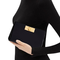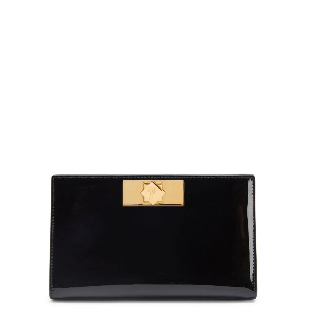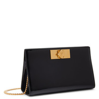 Product Details Patent leather clutch bag with central fastening, chain shoulder strap and inner card slots. - Black patent leather - Golden metal nut-shaped turn lock clasp closure - Golden metal shoulder strap - Black fabric inner lining with card slots - Size: 200 mm x 120 mm x 70 mm ORIGIN: ITALY COLOR: BLACK