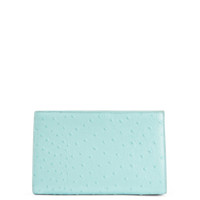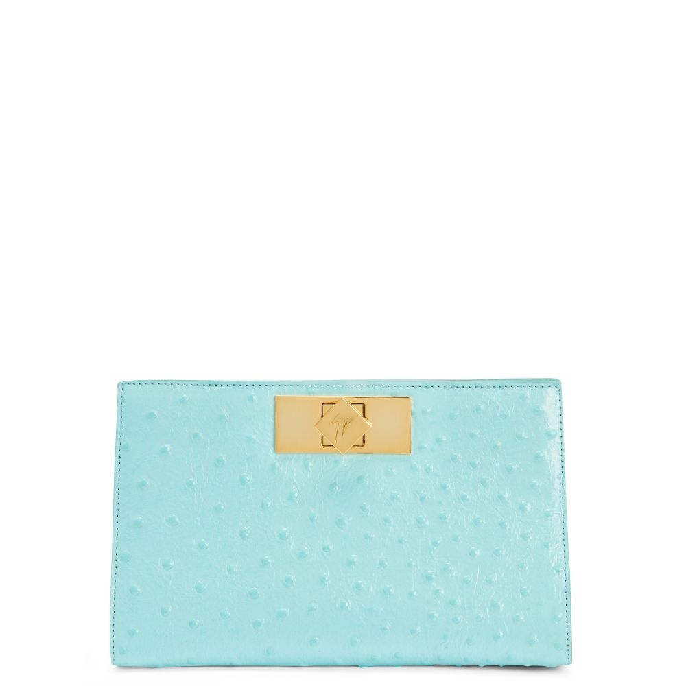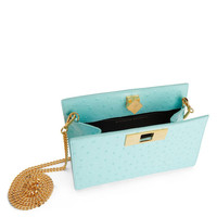 Product Details This clutch bag is crafted from light-blue leather with an ostrich print and features a golden metal nut-shaped turn lock clasp, a golden metal shoulder strap and a black fabric inner lining with card slots. - Light-blue ostrich-print leather - Golden metal nut-shaped turn lock clasp - Golden metal chain shoulder strap - Black fabric inner lining with card slots - Measurements: 200 mm x 120 mm x 70 mm - Made in Italy ORIGIN: ITALY COLOR: BLUE