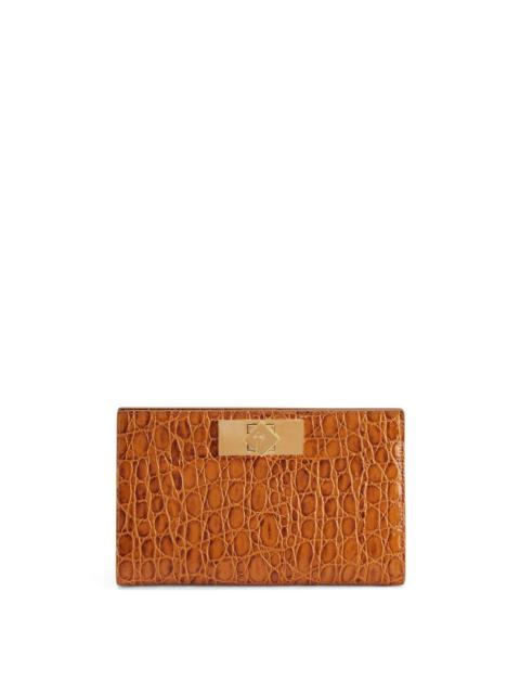 Product Details Clutch bag in crocodile-print leather with central fastening, chain shoulder strap and inner card slots. - Black crocodile-print leather - Fastened with golden metal turn-lock clasp - Golden metal shoulder strap - Black fabric interior with pocket - Size: 200 mm x 120 mm x 70 mm ORIGIN: ITALY COLOR: BLACK