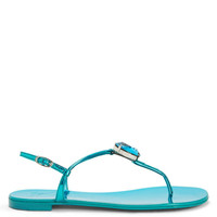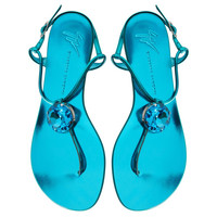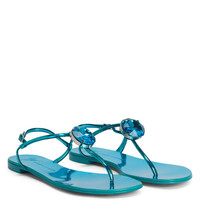 Product Details These flat thong sandals, crafted from mirror-effect light-blue synthetic fabric with matching laminated leather soles, feature thin straps and a small silver metal side buckle and are embellished with silver metal hardware with a maxi light-blue rhinestone. Mirror-effect light-blue synthetic fabric Silver metal hardware with maxi light-blue rhinestone Adjustable ankle strap with silver metal buckle 10 mm heel Light-blue laminated leather sole with logo Made in Italy