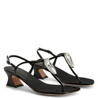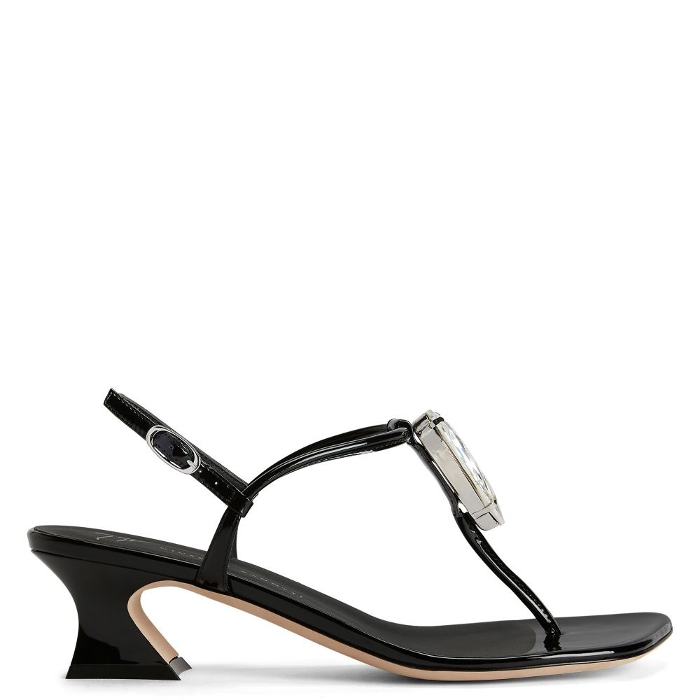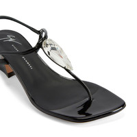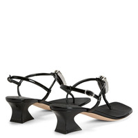Product Details These thong sandals, crafted from mirror-effect black synthetic fabric, feature matching laminated leather soles, matching covered spool kitten heels, thin straps and a small silver side buckle and are embellished with a silver metal hardware with a maxi silver rhinestone teardrop. Patent-effect black synthetic fabric Silver metal hardware with teardrop crystal rhinestones Adjustable ankle strap with silver metal buckle 45 mm silver chrome-plated heel Leather sole with logo Made in Italy