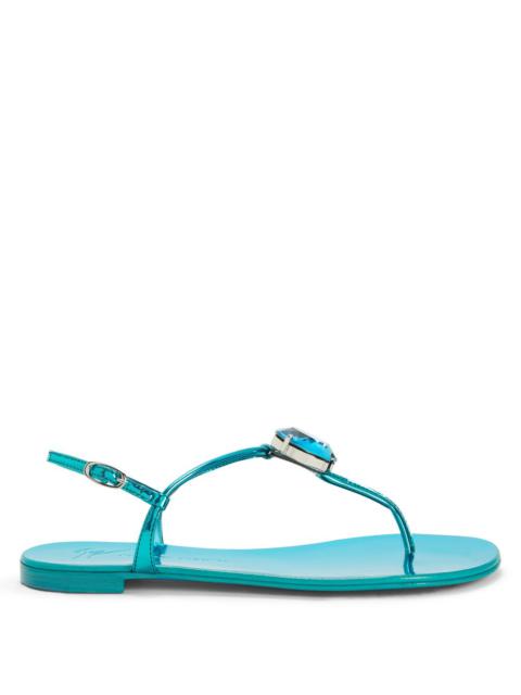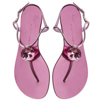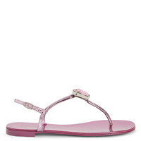 Product Details These flat thong sandals, crafted from mirror-effect pink synthetic fabric with matching laminated leather soles, feature thin straps and a small silver metal side buckle and are embellished with silver metal hardware with a maxi pink rhinestone. Mirror-effect pink synthetic fabric Silver metal hardware with maxi pink rhinestone Adjustable ankle strap with silver metal buckle 10 mm heel Pink laminated leather sole with logo Made in Italy