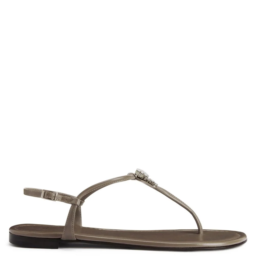 Product Details Flat thong sandals in leather with rhinestone detail, metal buckle-adjustable strap and leather-covered insole. - Taupe leather - Silver-colored metal accessory with crystal-colored rhinestones - Heel height: 10 mm - Brown leather sole with logo ORIGIN: ITALY COLOR: GREY