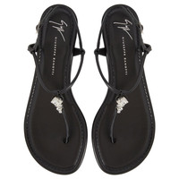 Product Details Flat thong sandals in leather with rhinestone detail, metal buckle-adjustable strap and leather-covered insole. - Black leather - Silver-coloured metal accessory with crystal-coloured rhinestones - 10 mm-high heel. - Brown leather sole with logo ORIGIN: ITALY COLOR: BLACK