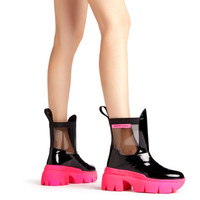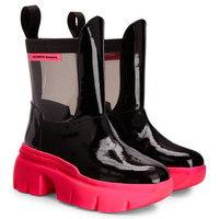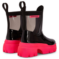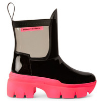 Product Details These ankle boots crafted from black patent leather and grey PVC feature a one-piece, neon-pink rubber chunky sole, a matching ‘Label Signature’ on the outside of the shaft and a black fabric pull tab to ease the fit. Black patent-effect synthetic fabric (34% PL; 66% PU) and grey PVC Black fabric pull-tab Neon-pink rubber 'Label Signature' with black logo 60 mm heel One-piece, neon-green rubber sole with logo Made in Italy