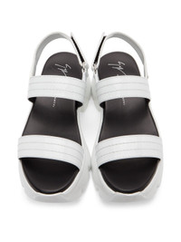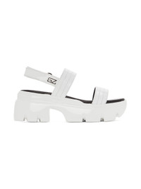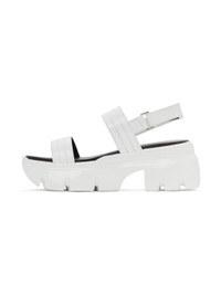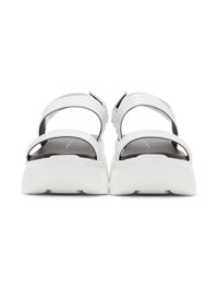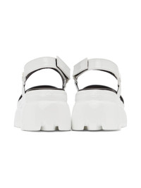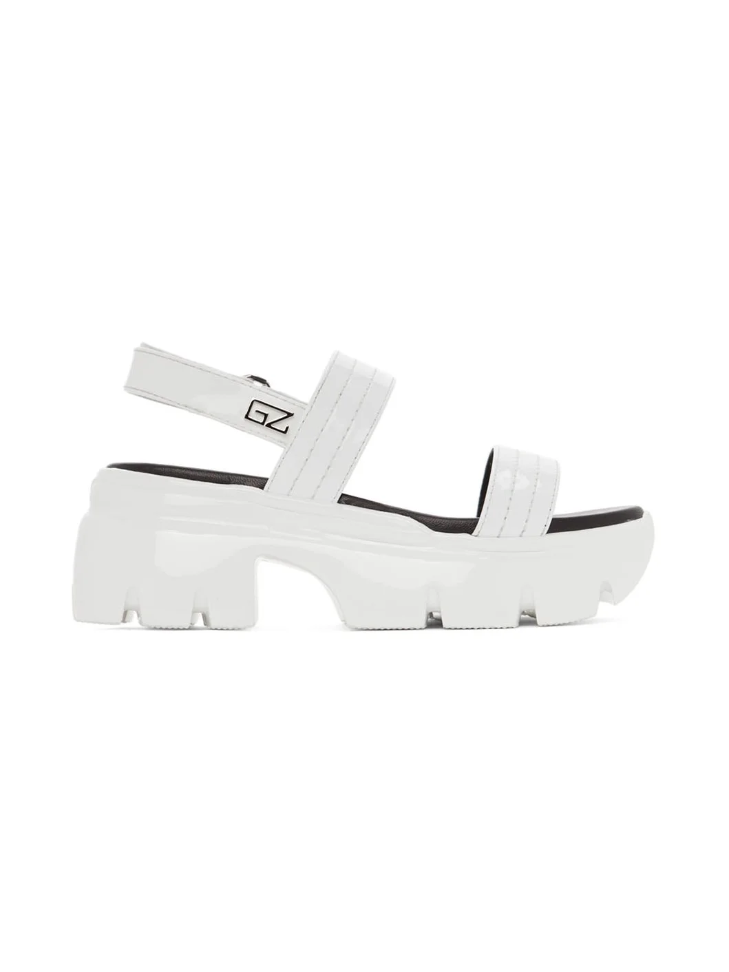 Patent leather sandals in white. Tonal topstitching at vamp. · Logo embossed at open round toe · Velcro slingback strap with logo hardware at outer side · Silver-tone logo stamp at black leather footbed · Platform rubber midsole · Treaded rubber outsole · Heel: H3 in · Platform: H2 in Supplier color: White Upper: leather. Sole: rubber. Made in Italy 221266F124022